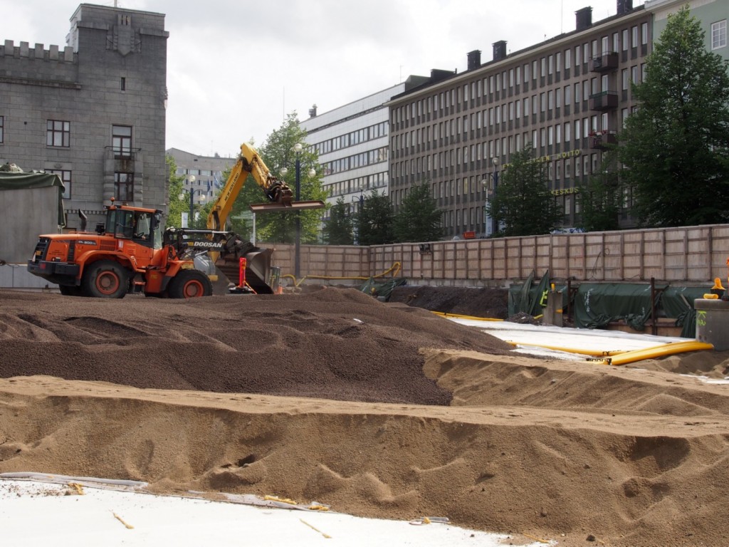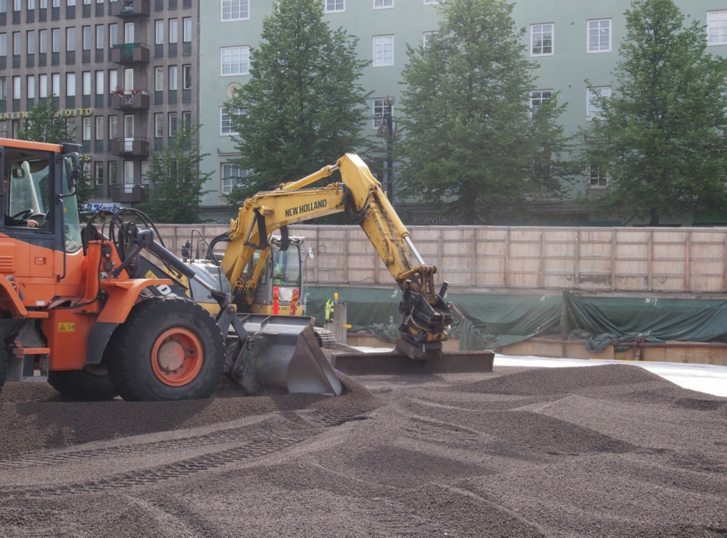 A 2-storey parking facility with 580 parking places was built under Lahti’s town square. Numerous installations water pipes, electricity and other services were installed onto the top of the upper deck of parking hall during the building process. The top of the parking hall now has been transformed in an outside market place. This required a lightweight material to reduce the generated load of the thick fillings.