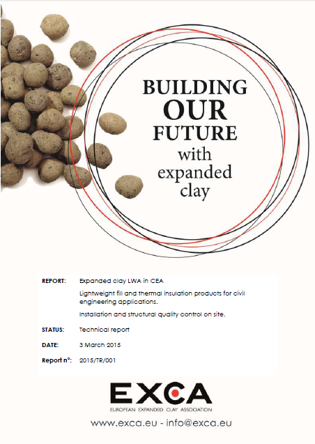 This Technical report was prepared by EXCA, the European Expanded Clay Association, in 2007 and revised in 2015. The goal and purpose has been to present the current best practice and recommendations on the European level concerning proper construction works and in-situ quality control to ensure a correct and proper execution of civil engineering applications of Expanded Clay lightweight aggregates. The basic material properties shall be documented and declared according to EN 15732 Light weight fill and thermal insulation products for civil engineering applications (CEA). Expanded clay lightweight aggregate products (LWA). This technical report is acknowledged by all the major partners in the European Expanded Clay industry, and thus should be considered as a recommendation from the industry. This report provides general recommendations prepared by the EXCA-industry and has no legal status. National standards, recommendations, instructions and guidance given in the specific projects have to be followed.