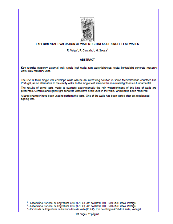 The use of thick single leaf envelope walls can be an interesting solution in some Mediterranean countries like Portugal, as an alternative to the cavity walls. In the single leaf solution the rain watertightness is fundamental. The results of some tests made to evaluate experimentally the rain watertightness of this kind of walls are presented. Ceramic and lightweight concrete units have been used in the walls, which have been rendered. A large chamber have been used to perform the tests. One of the walls has been tested after an accelerated ageing test.