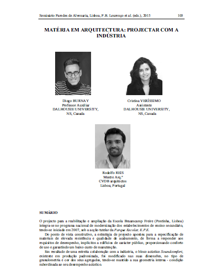 The project for the rehabilitation and expansion of the School Braamcamp Freire (Pontinha, Lisboa) is part of the national program to modernize High Schools, having started in 2007 under the safeguard action of Parque Escolar, EPE From the construction point of view, the design strategy pointed to the specification of high strength and quality finishing materials, in order to meet the performance requirements implied by the public character of buildings, providing comfort of use and ensuring low maintenance costs. As a result of close collaboration with industry, acoustical block Soundcomfort, existing in standardized production, it was modified in size, the type of particle size and color of their households, and remained its internal geometry – subordinate status to its performance Acoustic. By optimizing these parameters, the new block was applied in different areas and contexts of Braamcamp Freire School, satisfying the sound insulation requirements, adapting to the dimensional constraints of existing buildings and adapting to the public character of spaces, demanding a comfortable surface finish to the touch.