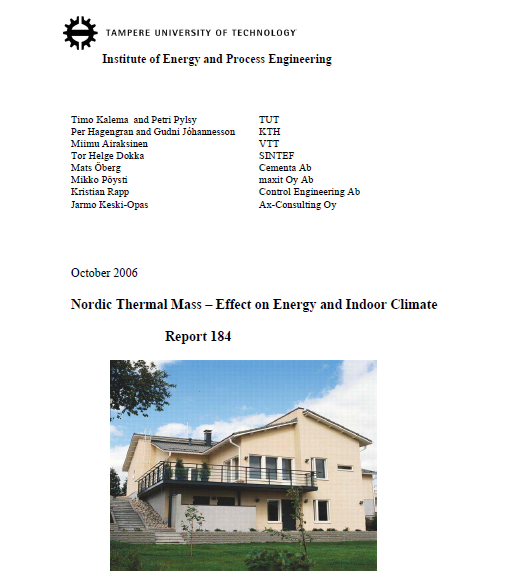 The importance of the thermal performance of buildings has increased due to e.g. the implementation of the Energy Performance Directive of Buildings. In this context energy certification systems of buildings will also require the calculation of energy consumption of buildings in future. The fact that the thermal mass of buildings decreases total energy consumption, is well known, but the amount of this effect depends on many assumptions and values used in the calculations. During this project it has been collected the best available Nordic knowledge around the table to develop a Nordic consensus about the questions studied. It’s important that we have in Nordic countries enough knowledge to be in the forefront in order to get our views included in the European standardisation. The thermal mass of buildings has a clearly positive effect on energy consumption and indoor climate. However, the buildings have to be designed cleverly to be capable to utilise possibilities for smaller energy consumption and better indoor climate. This project was a co-operation project with research institutes of Nordic countries. There were used six different energy calculation software’s, whose results were compared with each other and with one program based on the European standard EN 13790, Thermal performance of buildings – Calculation of energy use for space heating and cooling. The main author of the report and the collector of the results was Timo Kalema from Tampere University of Technology.
