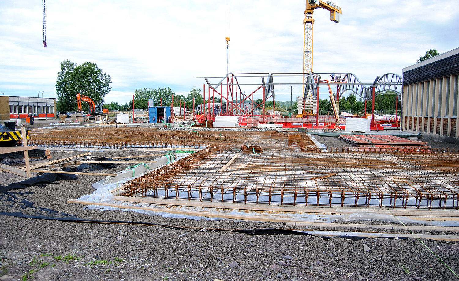 The building is on soft soil, and a special foundation was needed. Possible solutions were either concrete piles or a lightweight compensation foundation.