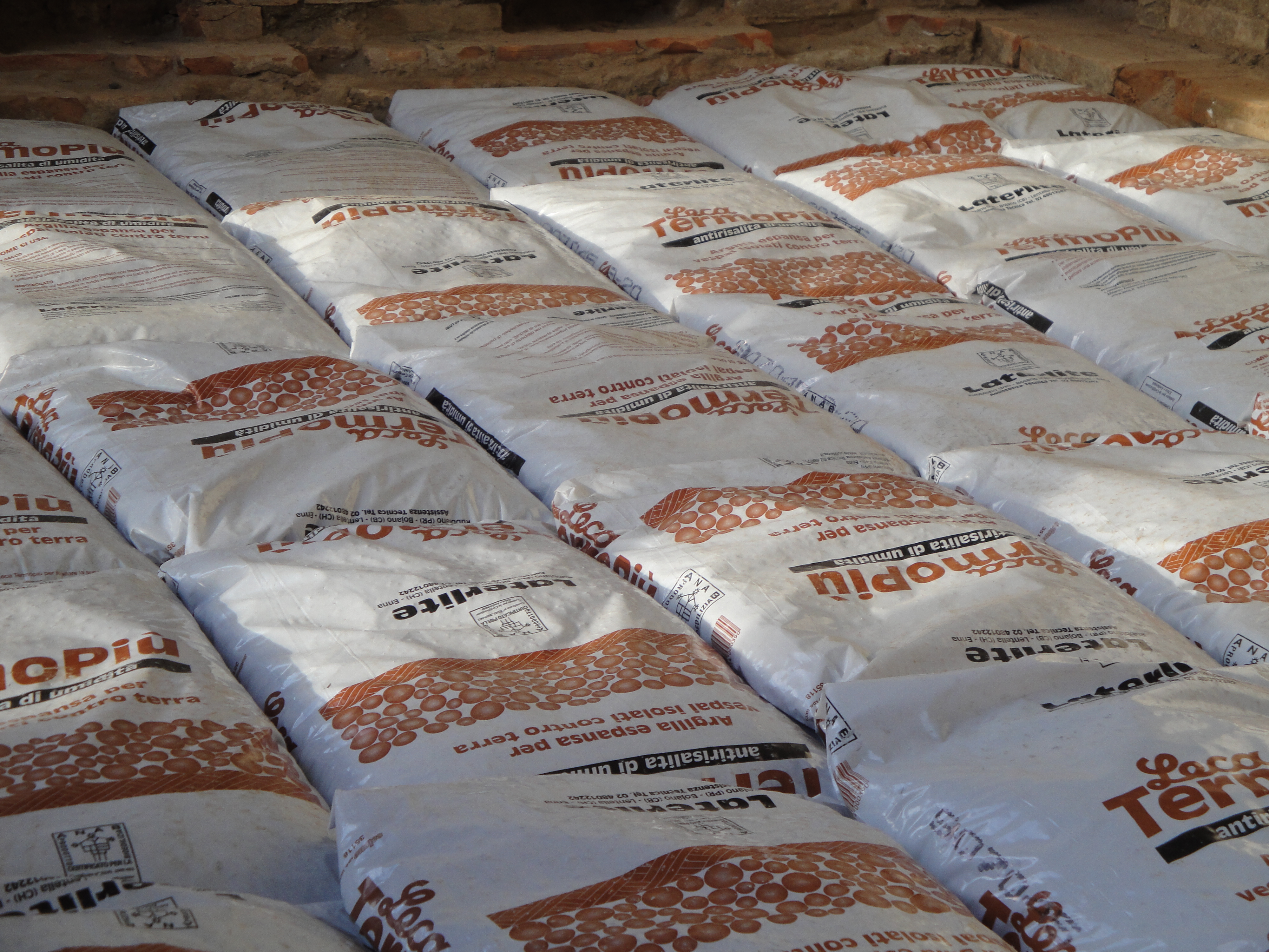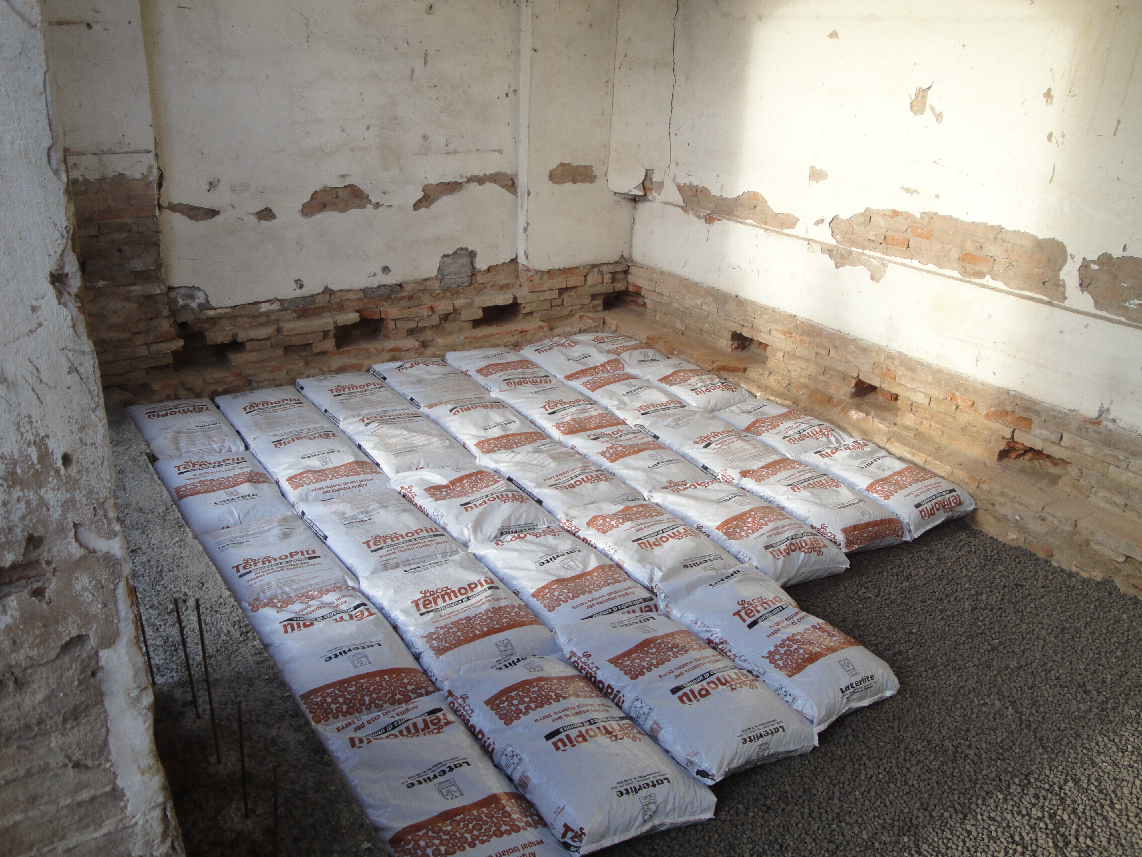 Expanded clay is used for thermal insulation thanks to its low conductivity, reducing heat loss into the ground. So a special type of expanded clay that is hydrophobic and does not retain water is used in granular form for quickly creating an insulating layer which is also very effective against rising damp. The expanded clay is laid directly in bags to simplify the laying of the material. The expanded clay light bags are also easy to transport with small vehicles to the city centre and then to handle into the building.