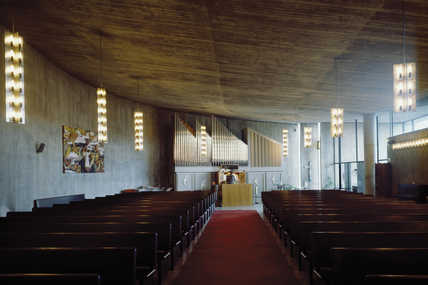 The church is situated in flat surroundings, but integrated in a local rock crag. The entrance was placed on top of the rock crag, and the high church walls was curved around down to the flat surroundings. All walls consist of parts of curves and straight lines, in the church corners separated by windows in whole height, giving a special light inside the church the walls are a little inclined.