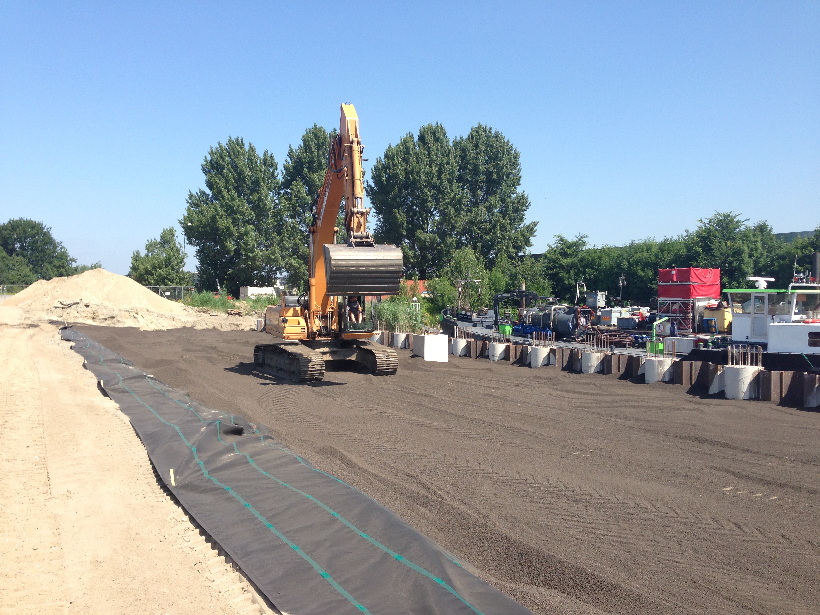 This project was executed in a wet environment. This made the reconstruction of the Uilenhaven a very helpful experience in handling the expanded clay aggregates in such circumstances. The main volume of expanded clay was delivered by boat and a small part in trucks and tipped directly into the working space.