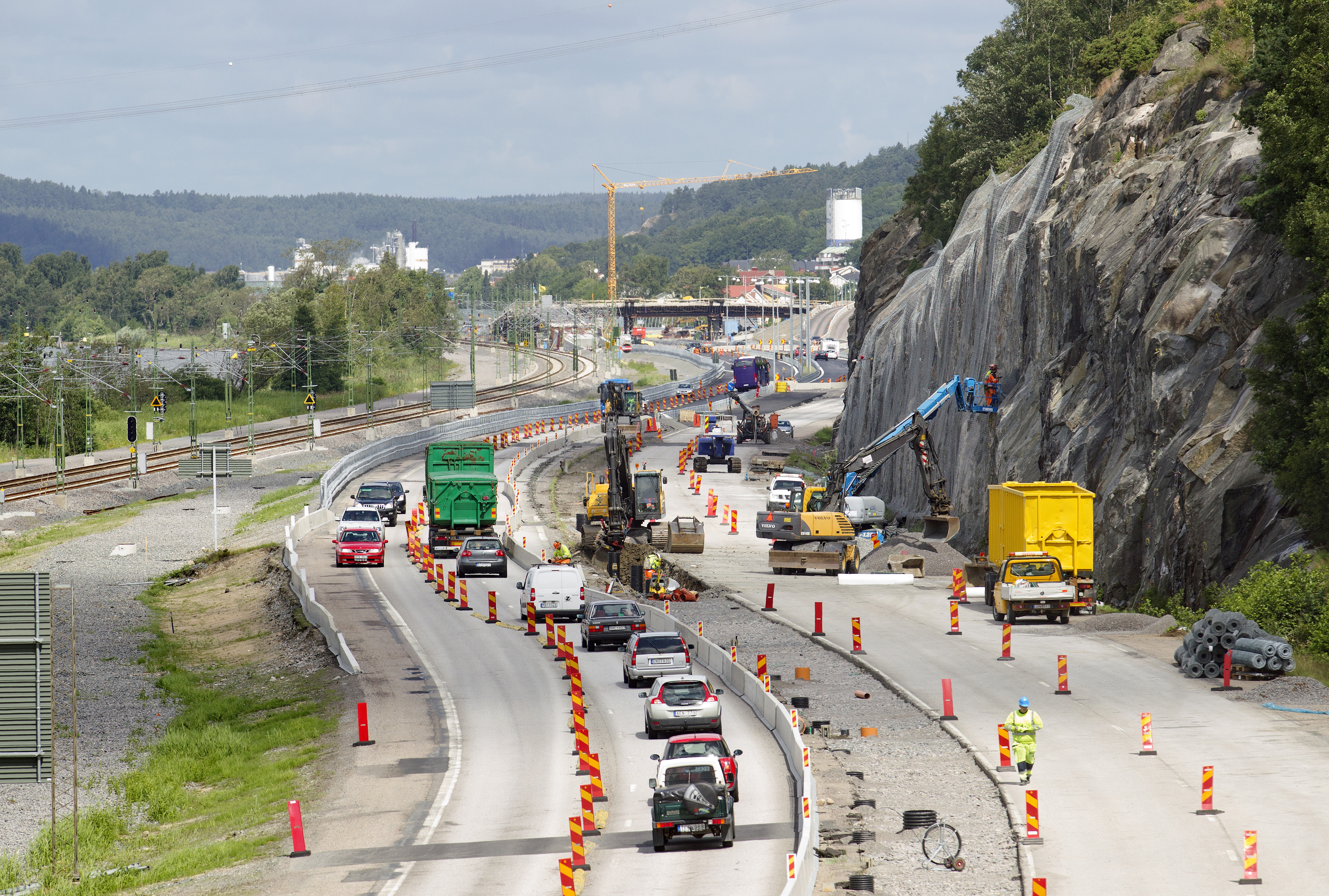 New construction and extension of highway and railroad along the Göta Älv river has been built during the last years. The area is exposed to risk for settlements and stability failure along the river bank. Both highway and railroad are built on top of deep clays. Installation of lime-cement columns in combination with light weight embankments has been a successful solution along some critical parts.