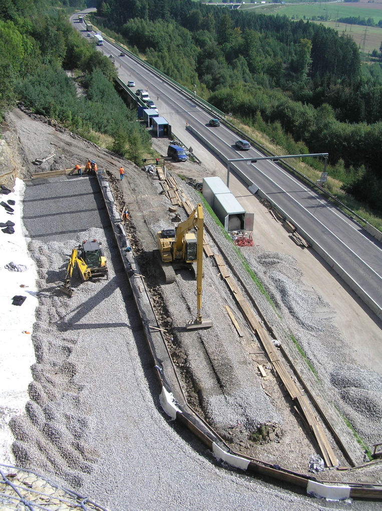 After finishing the highway L/35 next Koclirov a hillside at the north-east entrance of tunnel Hřebeč became destabilized. Bad geological conditions and a sandstone penetrated by water made the whole hillside crashing down, blocking the entrance of the tunnel and caused an accident on the highway. It turned out that a supporting construction with a stabilizing foundation next to the road and a leaning construction without putting too much pressure on the existing hillside would be the best. In addition the construction offers the opportunity for greening. The geological conditions required a careful logistic concept without being a danger or a barrier for traffic.