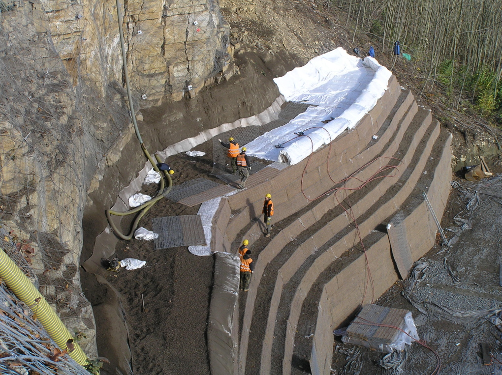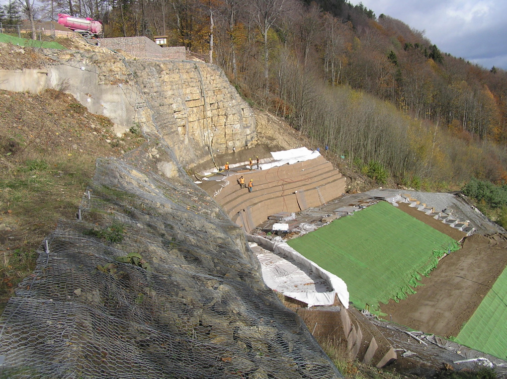 To remediate a slope this application was done for the first time in this way. So it was an interesting project, especially in combination with geotextiles as a kind of reinforcement. After constructing the foundation the new hillside was build up in layers of expanded clay with geotextile covered gabions which were filled directly at the site by blowing expanded clay to the installation location. So a minimum load and a high stability in its own were guaranteed. The material was delivered and stored on top of the hill making a fast application possible.