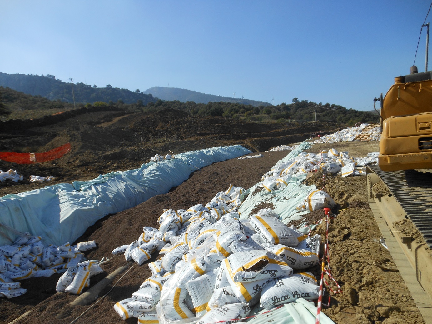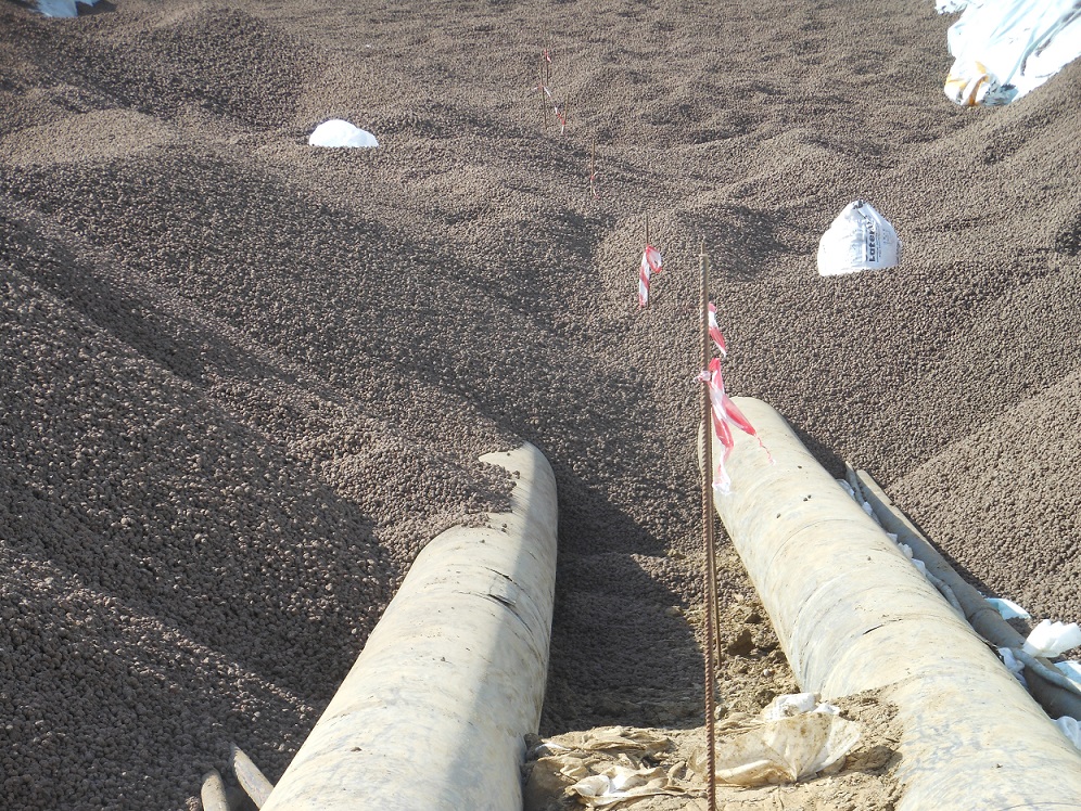 The expanded clay with was the best possible technical economic choice. It was transported to the construction site in 50 litres bags with dozer and in the site the bags then the bags were open and the expanded clay laid by hand.