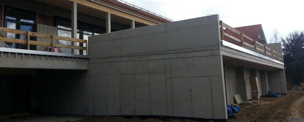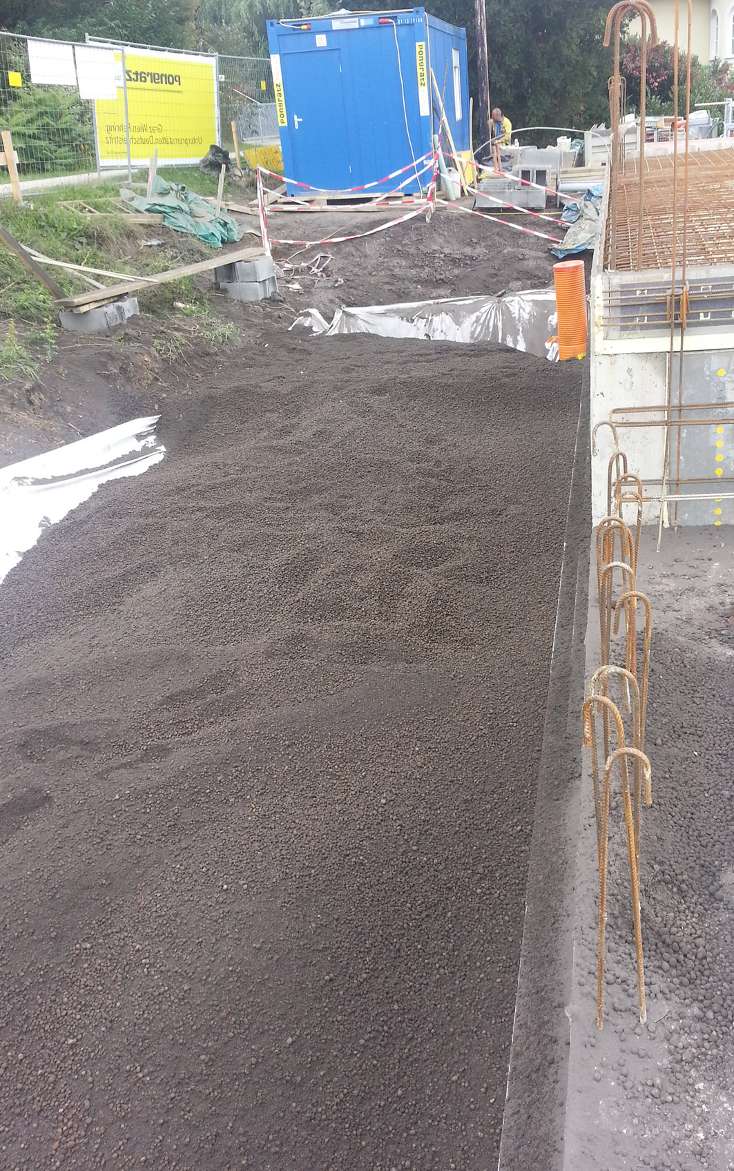 Directly on the surface a geotextile was put on. The material was blown out to backfill the space between foundation and slope. By blowing the material into the cavities inside the foundation, a stable underground for the pool could be achieved than to build the level for the swimming pool. After this the pool made of concrete was backfilled with expanded clay.