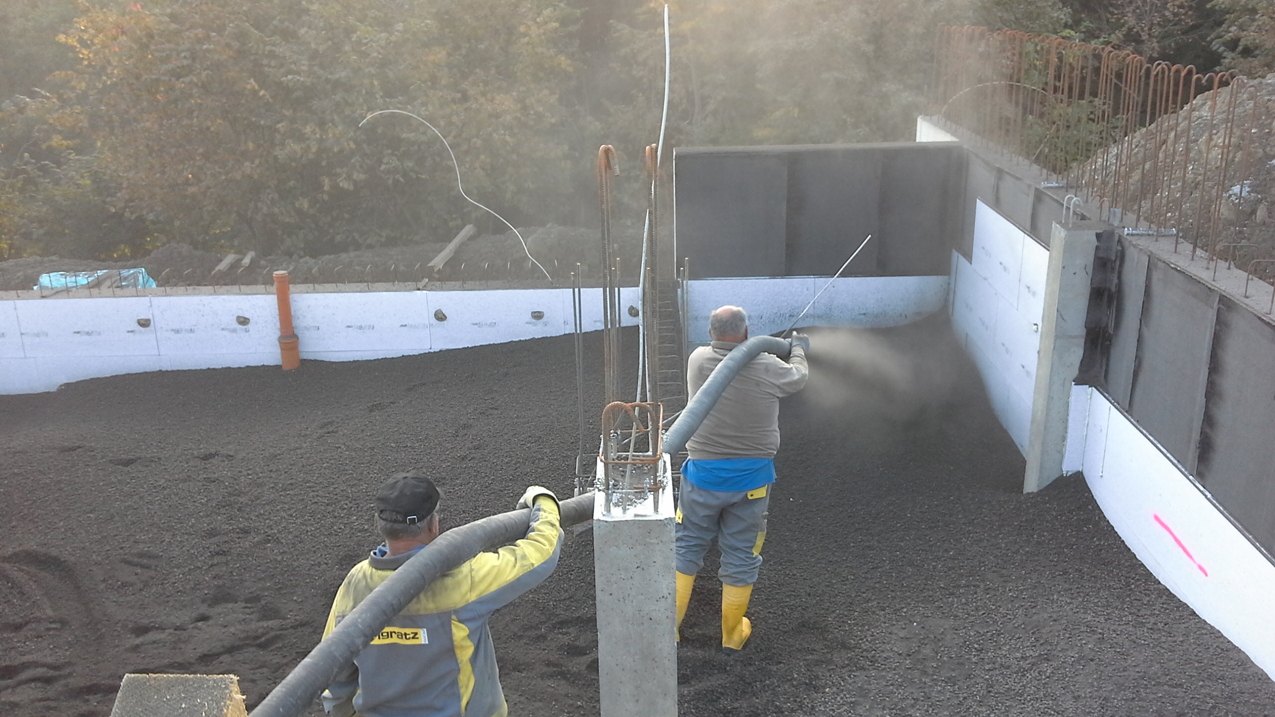 Because of the hillside the project consists of three parts. 1st) to build a horizontal foundation for the pool, 2nd) to fill the space between slope and foundation and 3rd) to backfill the the pool itself. After finishing the big construction of the foundation it was necessary to fill up the cavities inside the foundation with a stable and durable material. Originally it should be done with common earth, but compacting seemed too difficult, especially in comparison with the stiffness of the concrete foundation. So, it was necessary and helpful to use a material with a low necessity for compacting- like expanded clay. The ability to inject the material offered the chance to reduce time and increase the comfort for the workers. Side effect was a plus in time because of the rapid method and it meant also a minus in costs for the owner.