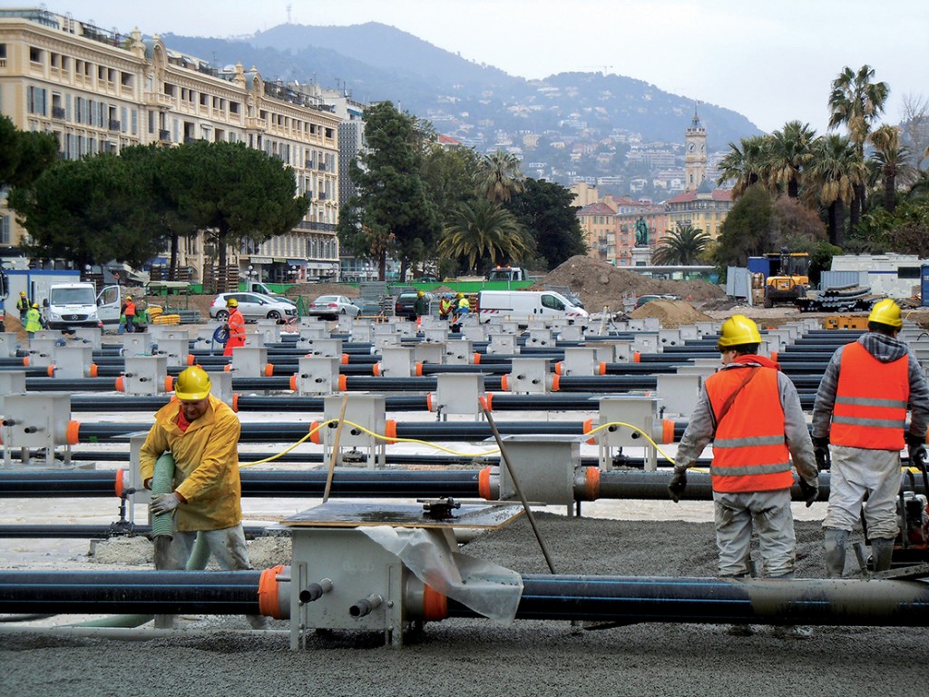 The Paillon river passes through Nice’s urban area under a concrete covering built between 1860 and 1972. The top surface of the covering has undergone a renewal project, creating a big linear urban park “coulée verte” and a giant water mirror (3.000 m2), close to the Massena Square. The bearing capacity of the Paillon concrete covering did not allow the use of heavy fills and supporting layers and therefore an 80-cm thick lightweight expanded clay base layer was chosen as a support for the water mirror. The expanded clay layer also insulated and protected the many water and compressed air piping and wiring needed for the fountain’s water games (128 water jets).