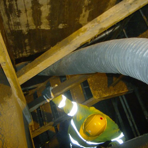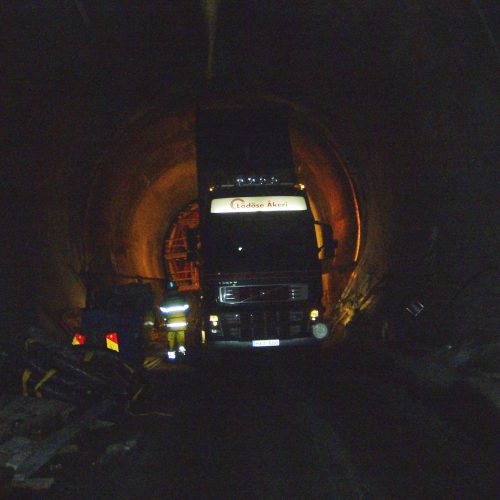 The installation of the expanded clay up into the overlaying cavities went very well, filling out the voids. Each blowing truck could drive into the tunnel to the right tunnel segment and use several sections of hoses to reach the place of installation.