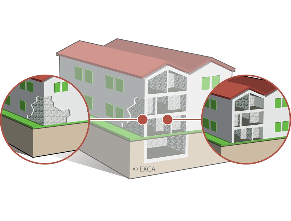 Great robustness of material to environmental exposures. Insulating properties. Stable construction with external walls built from sandwich blocks and internal walls of standard expanded clay blocks.